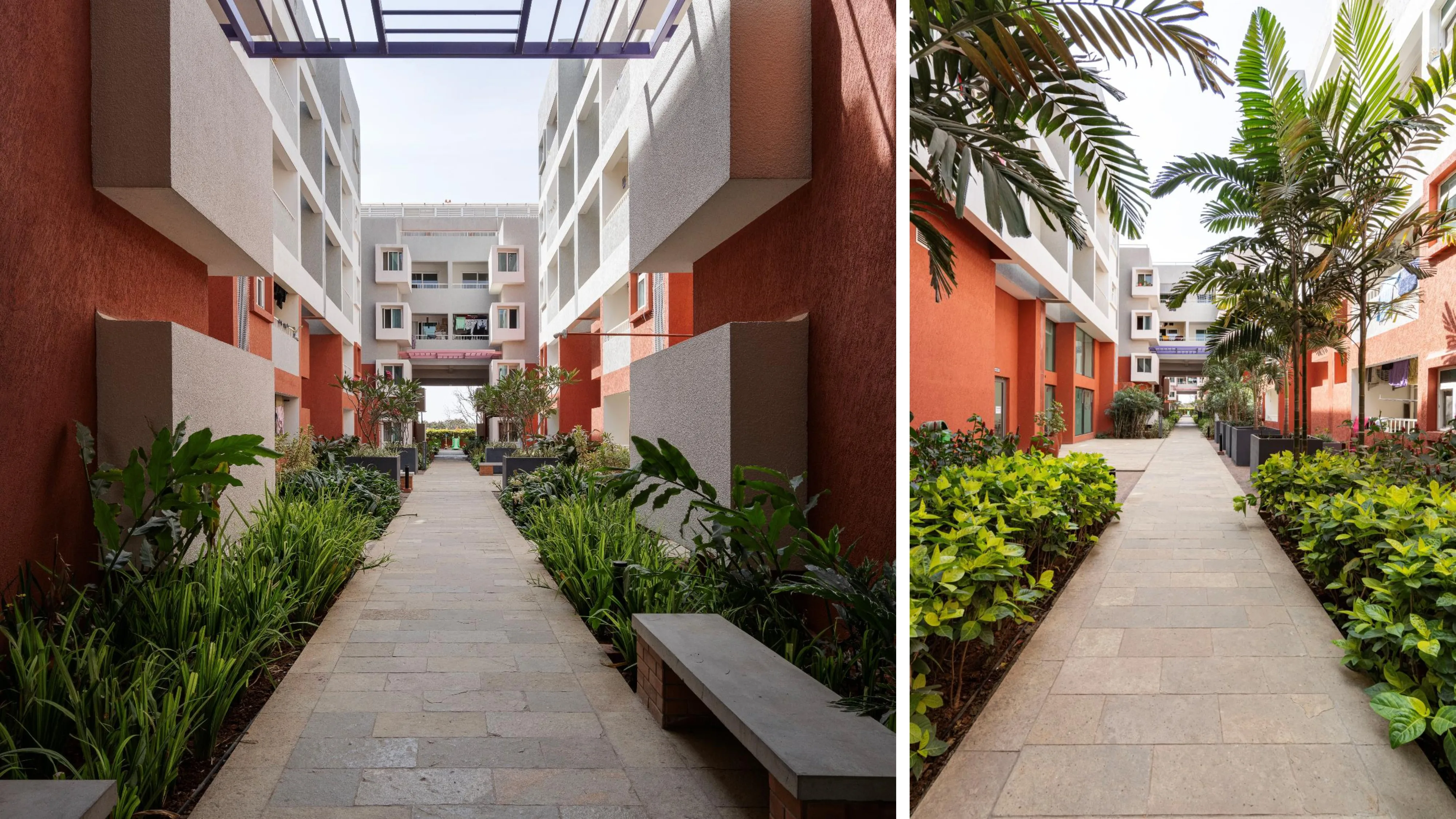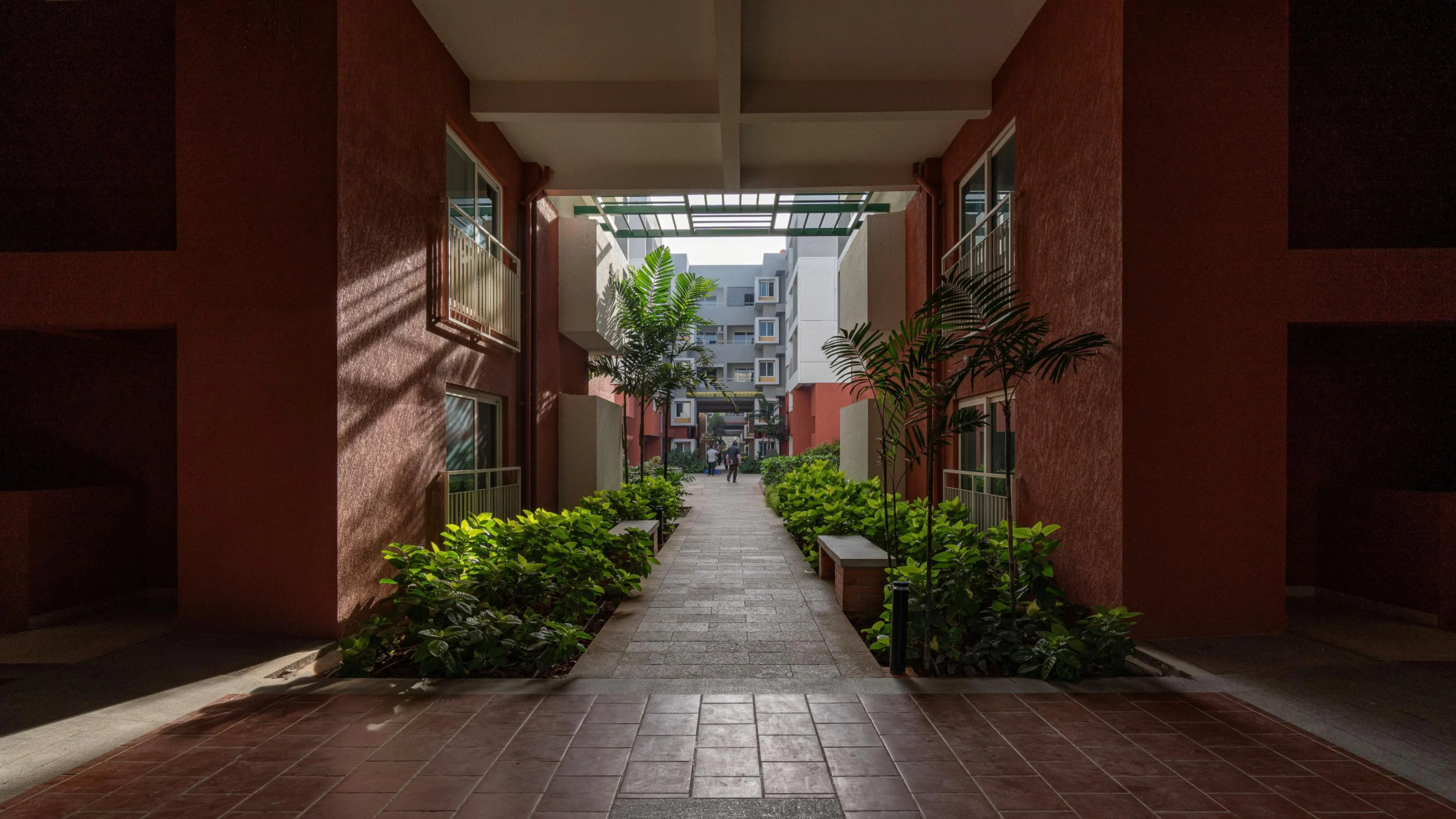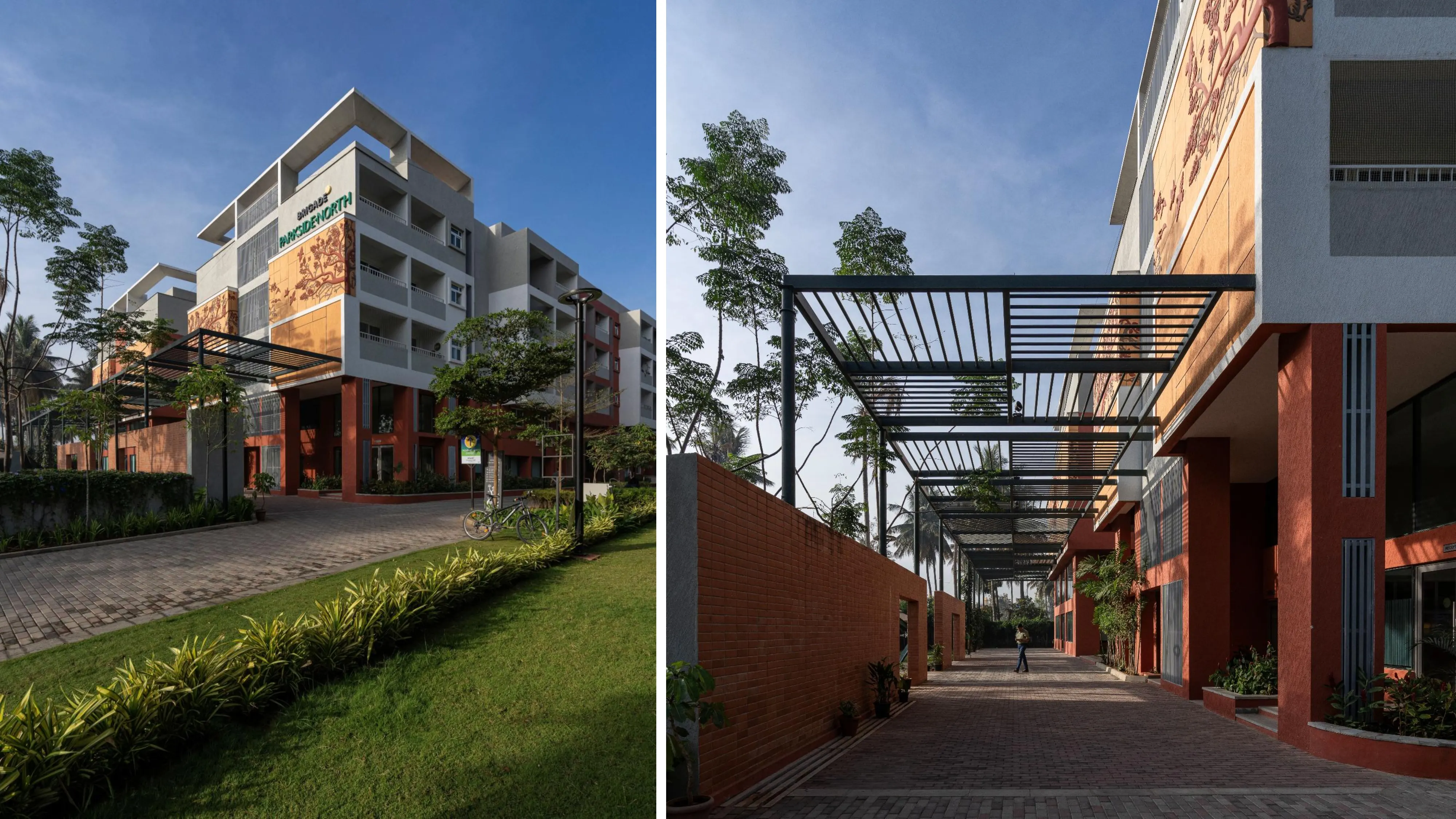 Brigade Parkside North has been designed to take advantage of a narrow and linear site while creating an ambiance that revolves around the idea of a streetscape of the traditional Indian city. The shaded streets, rich landscapes and a myriad of activities enliven the street and make it an active community and social space. Each block is entered through double-height lobbies that tie back to the street and create a rich circulation experience. A multipurpose hall, gymnasium, common dining facilities, swimming pool, indoor games, children’s’ play area and amphitheater are strung along the expanse of the development and open out onto the street, creating a rich streetscape experience. Like the traditional city, units also span across the street at strategic locations, creating a variegated pattern of light and shade.