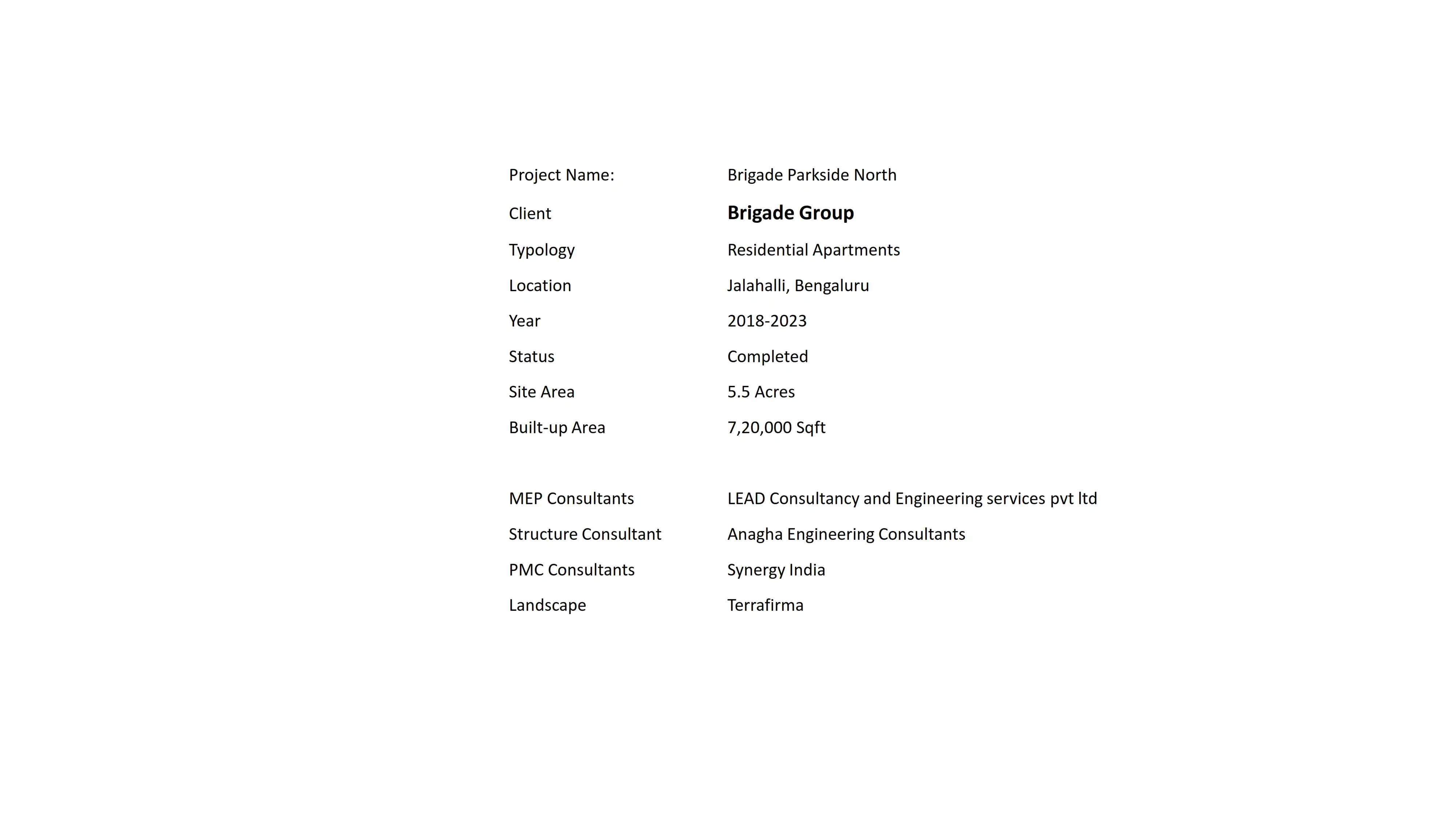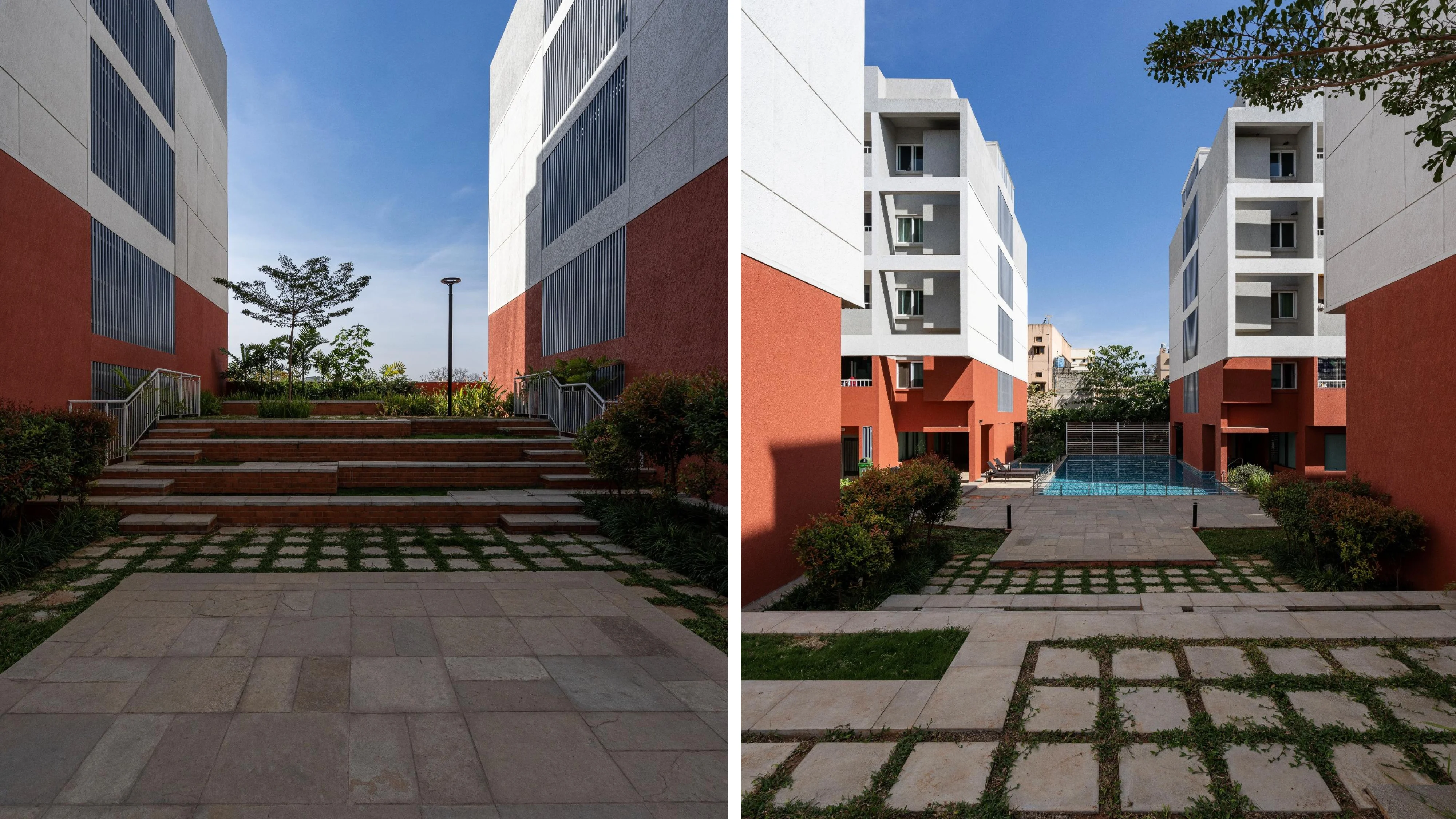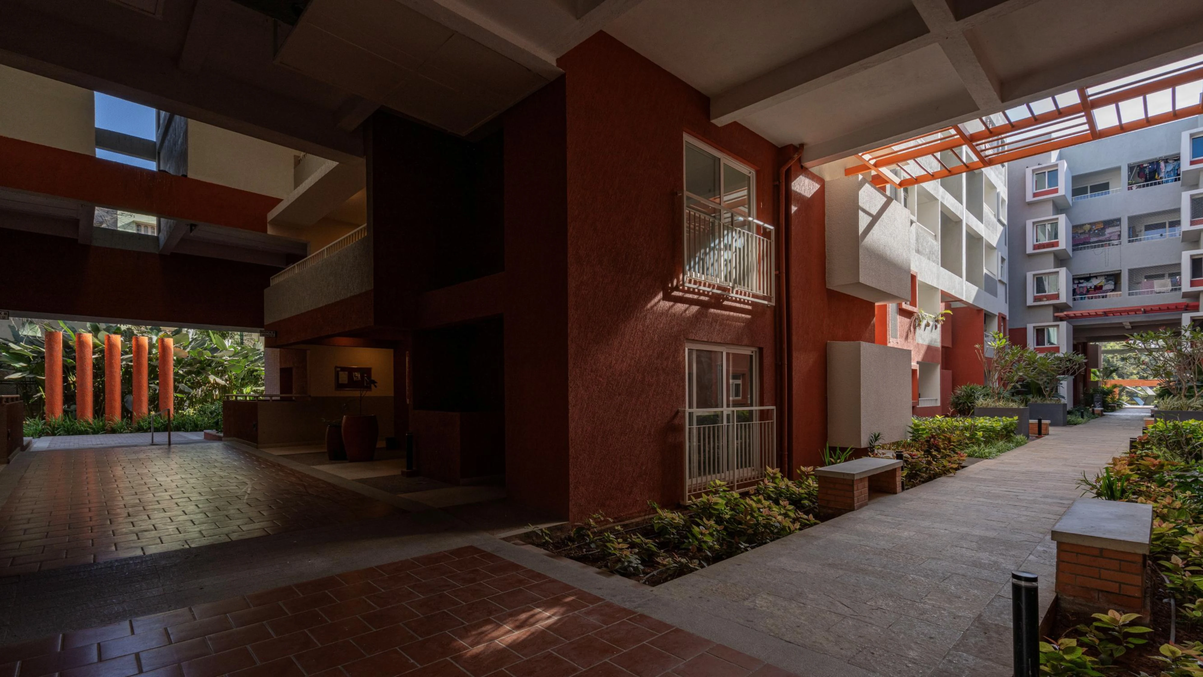Brigade Parkside North has been designed to take advantage of a narrow and linear site while creating an ambiance that revolves around the idea of a streetscape of the traditional Indian city. The shaded streets, rich landscapes and a myriad of activities enliven the street and make it an active community and social space. Each block is entered through double-height lobbies that tie back to the street and create a rich circulation experience. A multipurpose hall, gymnasium, common dining facilities, swimming pool, indoor games, children’s’ play area and amphitheater are strung along the expanse of the development and open out onto the street, creating a rich streetscape experience. Like the traditional city, units also span across the street at strategic locations, creating a variegated pattern of light and shade.